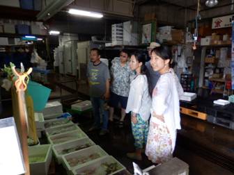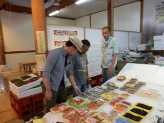 男性陣は,貝のお勉強 決して酒のつまみを物色しているのではありません。