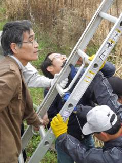 はしごを支えるほうも,結構力仕事です。