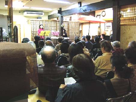 音楽を聴き、休憩は旧家の町屋作りを愛でながら離れ座敷でお茶のおもてなし。そんなコンサートが旧街道の入江呉服店で開かれました。 4月9日午後7時、新聞で報道されたこともあって参加者は60名のお客さんで埋まりました。演奏者はオーボエの山本由美子さん、伴奏はエレクトーンでフォスター作曲の「金髪のジョニー」で幕を開け、グリーンスリーブス・シューベルトのセレナーデと続くと、オーボエの妙なる音色に酔いしれた感じの皆さんです。更にフィガロの結婚から「恋の悩みを知る君は」でテンポは一転、明るい感じで前半を終了。」