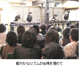 入江呉服店の企画で始まった“町屋コンサート”、第2回目は、広島ジュニアマリンバアンサンブル“マリンバ・エキスパーツ”の演奏でした。 5月28日は可部の高松山に大文字が点灯される日です。入江さんの計らいで、演奏会終了後「寺山歩道橋」から大文字の灯火を観賞する催しも行うことになり、これをカラスが担当です。 先ずはマリンバの演奏から…。演奏者は6名。2台セットした楽器を交代で演奏です。 今回の申込はたちまち予定数オーバーの66名にもなり、大盛況です。カラスは、会場受付、案内・交通整理を担当して、音楽はお客さんに聞いてもらうことにしました。