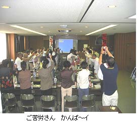 | ビデオの上映が終わって会場が明るくなると拍手が起きました。「若い人たちはすごい。これからもいっしょにやれる」とか「表情がとっても明るくて、ダンスをする若者の動きも溌剌として頼もしかった」などの声も聞こえます。 当初は参加グループの代表者数名の声をいただく予定の司会も方針を変更、できる限り多くの人から声をいただくことに。ここでメッセージの概要を紹介します。 ・横川商店街進行組合 松木理事長さん 「可部はなにをやっても“すごい”の一言です」 ・可部警察署長さん 「当日の様子を実際に見ましたが、皆さんの表情がすばらしかった、今後も協力したい。」 ・ 〃 交通課長さん 「皆さんの動きを見て…」と絶句。参加者も感動しました。 ・文教高校校長さん 「いろんな形で協力できた。今後も皆さんの活動をできるだけ応援します」 ・文教の本多(武吉役)先生 「カラスの飲み会に、もう3回も参加しました。」 ・祇園町商工会 桑本会長さん 「可部と横川にはさまれて今まで活動する機会が無かったが、今後は積極的に関わ りたい」 ・広島県見民踊協会可部支部 西川さん「雨対策は慣れているので万全。楽しいひと時をすごせました」 | |||