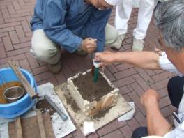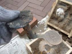 まず本物のお金を置いて,その上に砂をかぶせ,固めます。