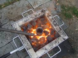 ルツボを火にかけ,温まったら,真鍮(水道の蛇口等)を入れます。