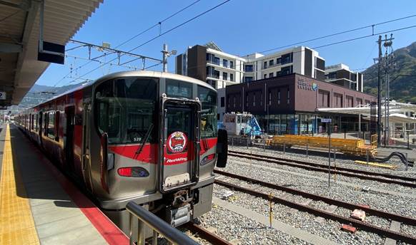 可部駅から電車。行いがいいのでカープ電車がやってきました。