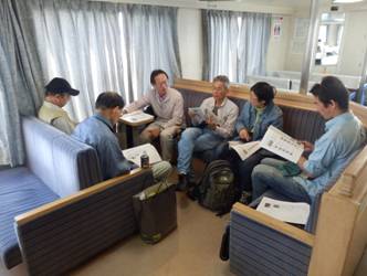 フェリーに乗り込むと,事前学習の始まりです。