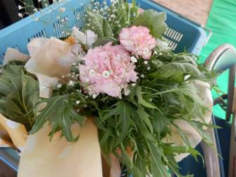 ブーケトスのブーケ,仲間の中浦君が育てた水菜や春菊で作成です。