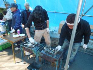 牡蠣も焼けました。若手ががんばります。