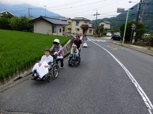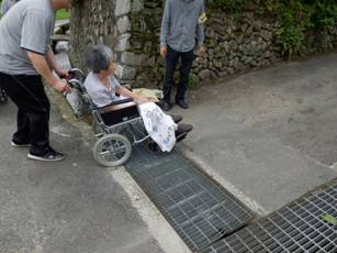 グループホームからの車椅子避難,みんなで手伝います。