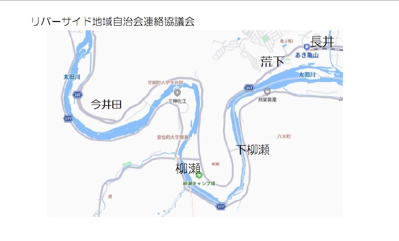 五つの自治会を繋ぐ、太田川に沿って走る県道宇津可部線、なんと6.6kmもあります。